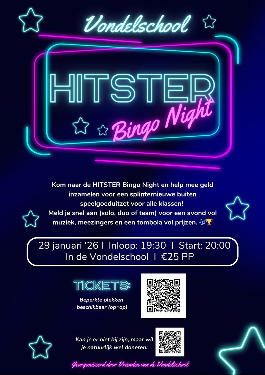 Met geweldige acties en terugkerende evenementen brengen we ouders, verzorgers en leerkrachten samen en halen we geld op. Afgelopen jaren waren er de Pubquiz, een terugkerend knalfeest voor ouders en leraren!, onze eigen Vondelschool Merchandise collectie waarbij van elke aankoop een deel naar het jaarlijkse spaardoel gaat én natuurlijk de vrijwillige bijdragen door het jaar heen. Dit jaar gooien we het over een nieuwe boeg en introduceren we de Hitster Bingo Night. Een avond om niet te missen!
